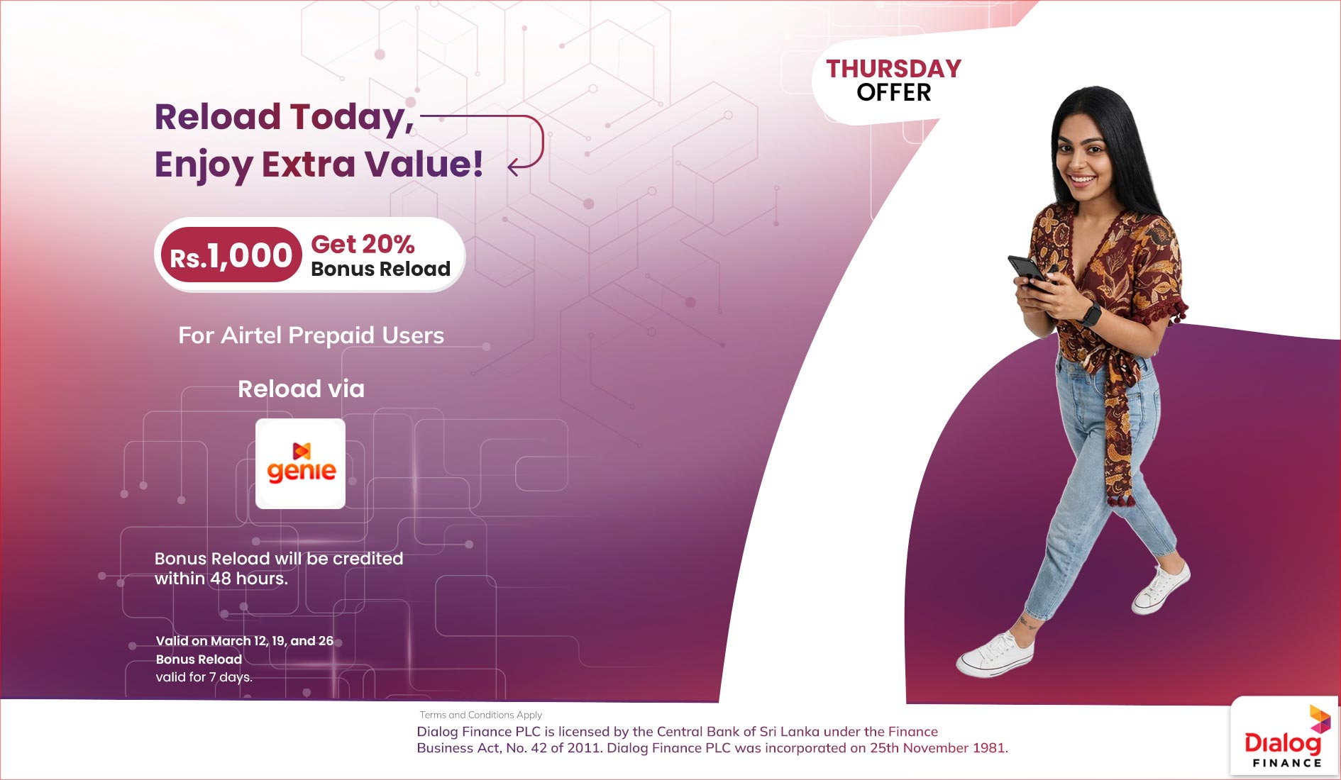 Reload Rs.1,000/= to your Airtel Prepaid Number via genie app or eZ Cash wallet (Dial #111#) and Get 20% Bonus Money to your Airtel Prepaid Number. Reward Valid for 7 Days.