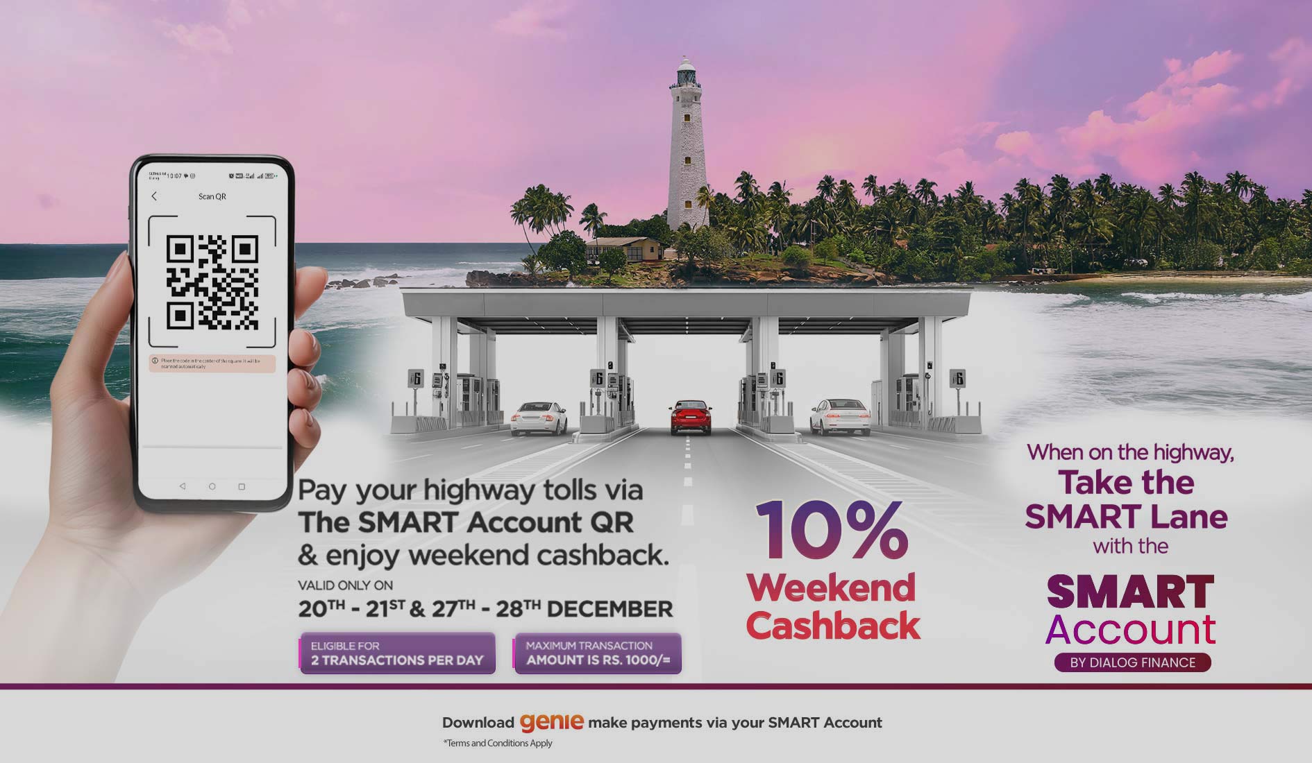 Enjoy 10% Cashback up to Rs.100 on highway toll QR payments with your Dialog Finance Smart Account.