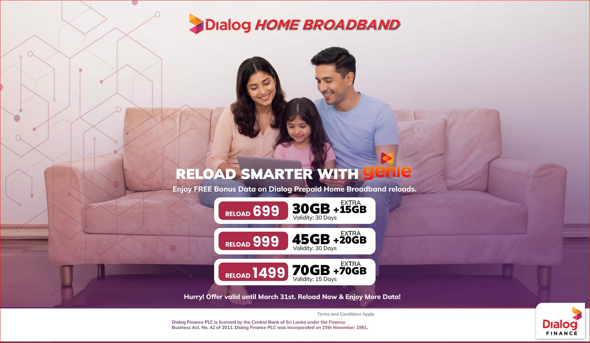 Reload your Dialog Prepaid Home Broadband Rs.699, Rs.999, or Rs.1,499 via Genie & get up to 70GB extra FREE.Valid Till 31st March 2026. T&C Apply.