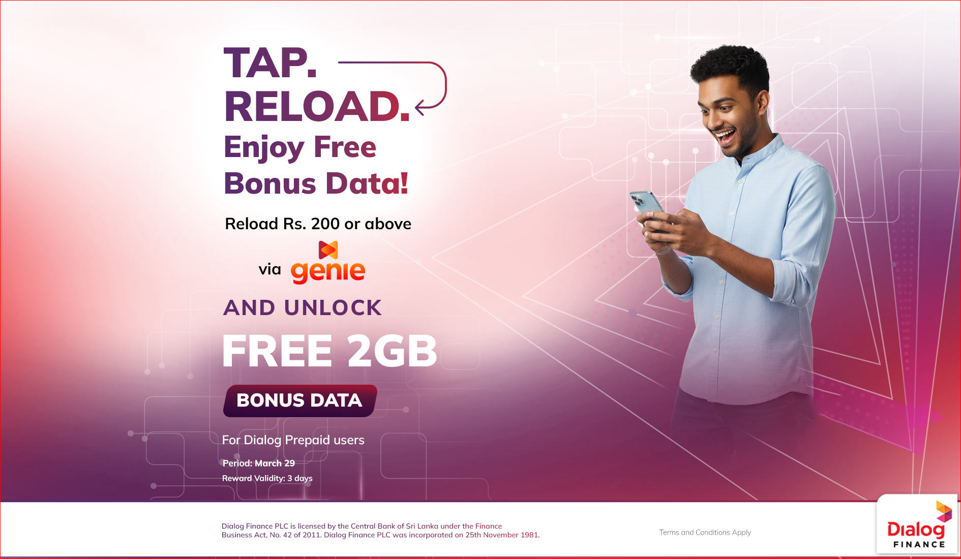 Simply reload Rs.200 or more through genie on 29th March, and Dialog will reward you with 2GB data valid for 3 days.