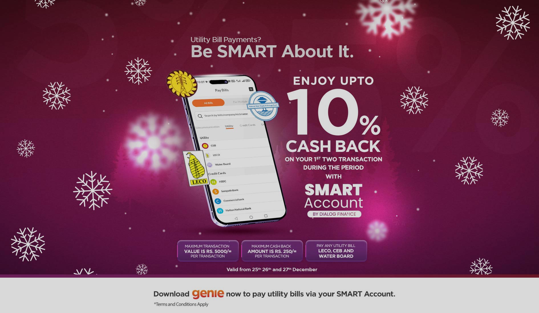 Christmas Special - Get 10% Cashback (5% per payment, up to Rs.250 each) on your first 2 utility bill payments via Genie using your Dialog Finance SMART Account.